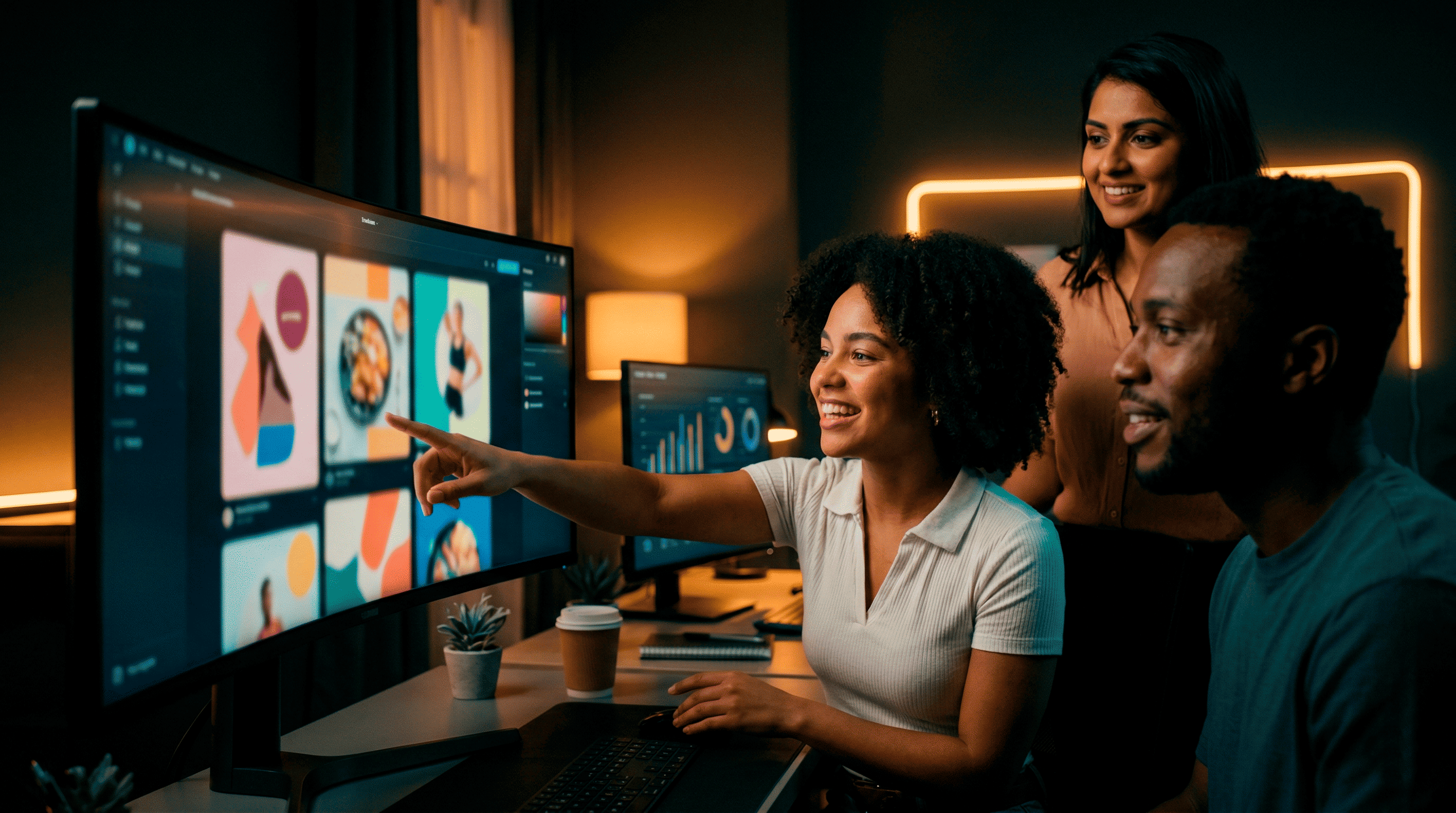 Sem esperar designer. Criativos, imagens, vídeos e social posts — seu conteúdo de uma semana em minutos.